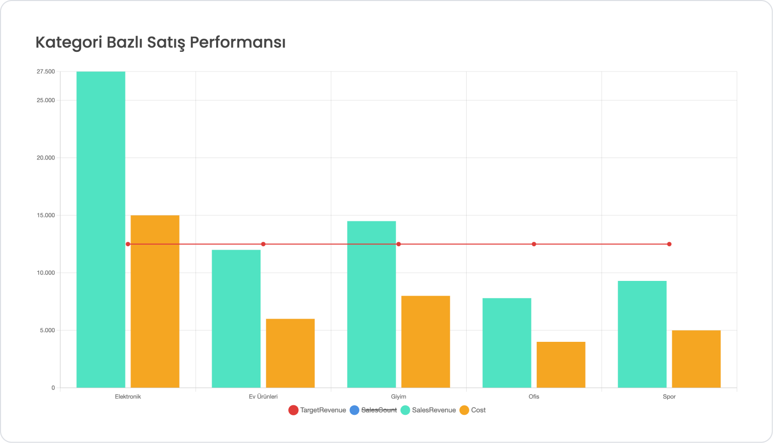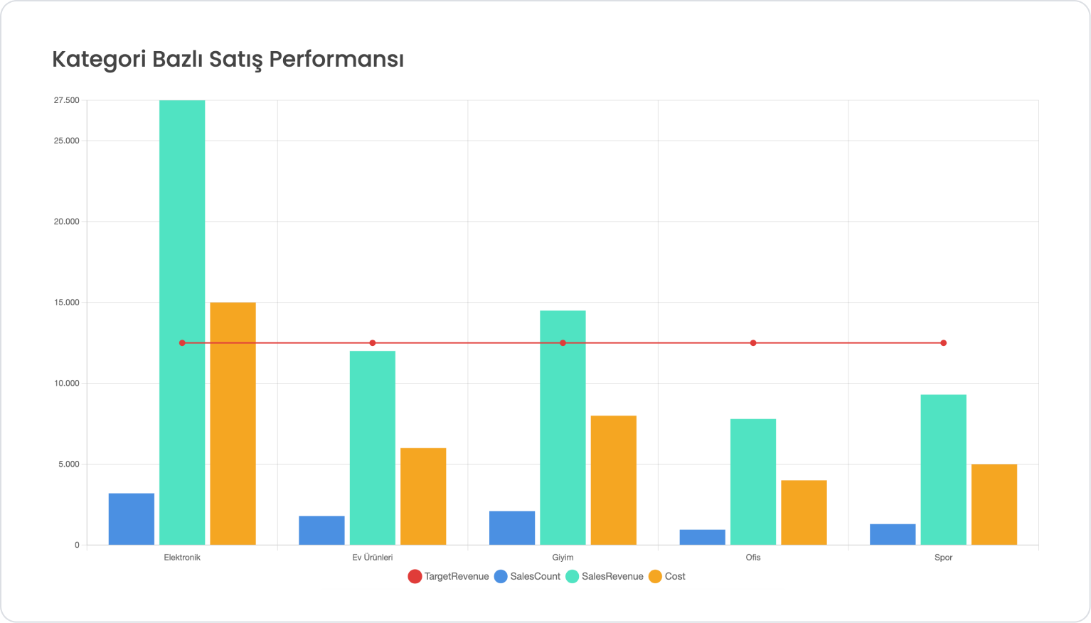 The Bar Chart element provides an effective and understandable way to compare categorical data. Thanks to the bars representing each category, users can easily compare the quantity or total differences between different groups. It is frequently preferred in sales analyses, evaluation of survey results, performance comparisons, and all categorical data visualization scenarios.