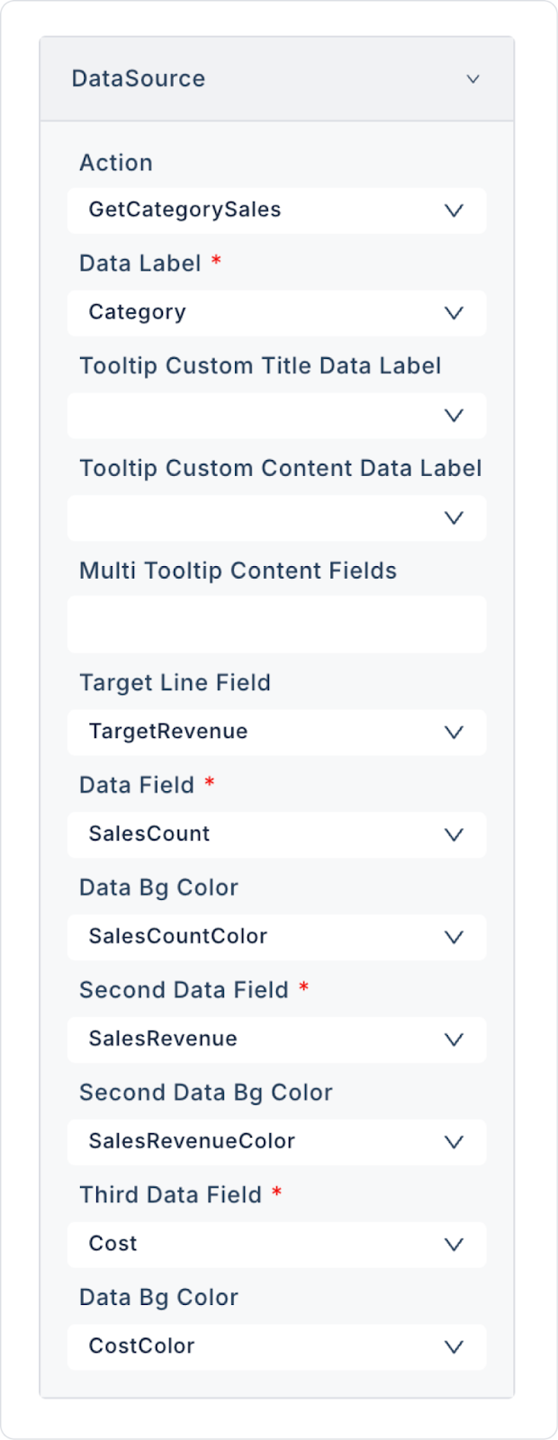 Multi Tooltip Content Fields: Allows you to display multiple data fields within a single tooltip. Used to present detailed data in charts with multiple bars.