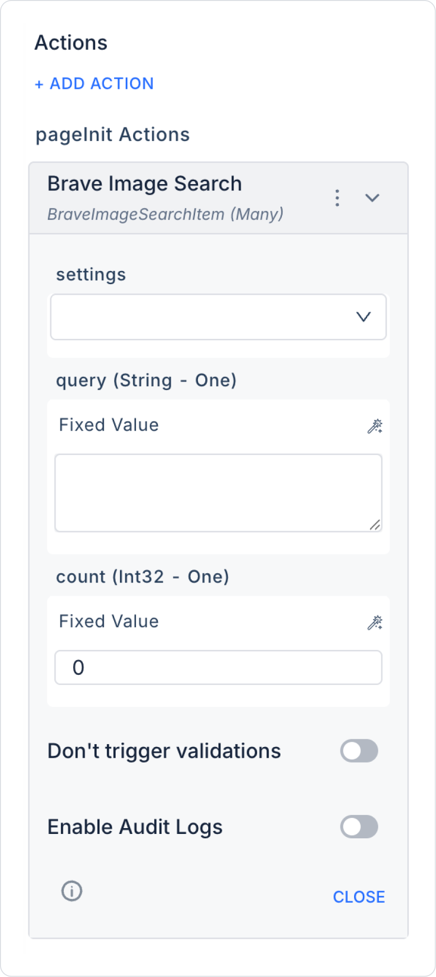 Click on the button, select the OnClick → Brave Search → Brave Image Search action from the + ADD ACTION menu.