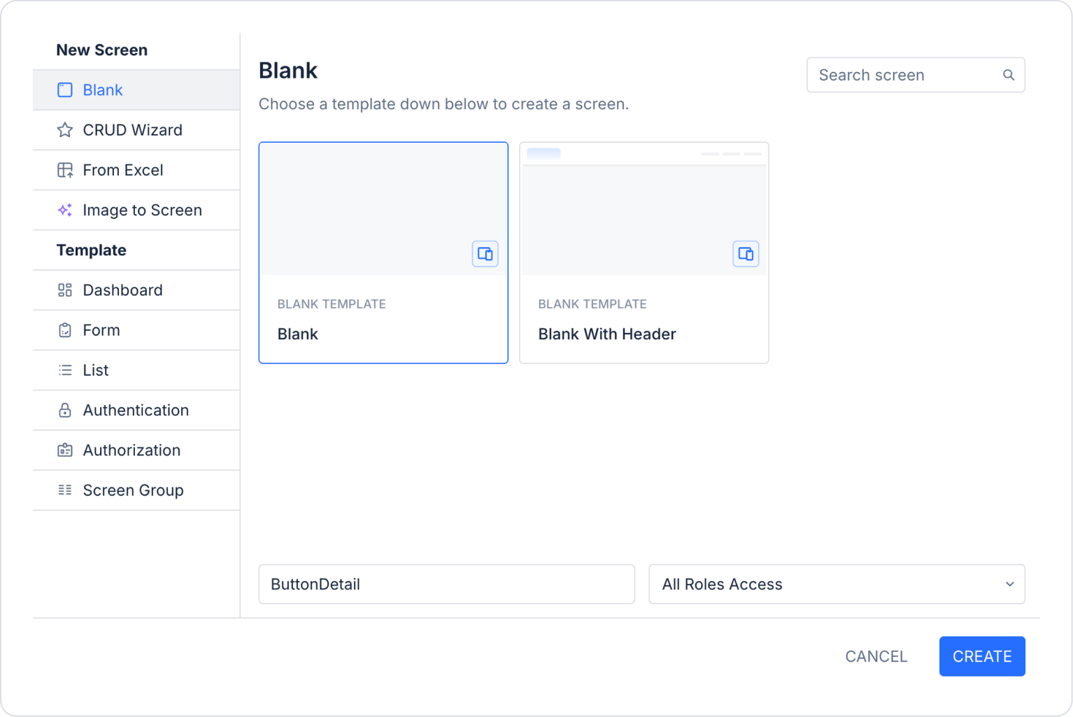 Create the page where the details will be displayed in the last side panel: Screens > New Screen > Screen name > ButtonDetail