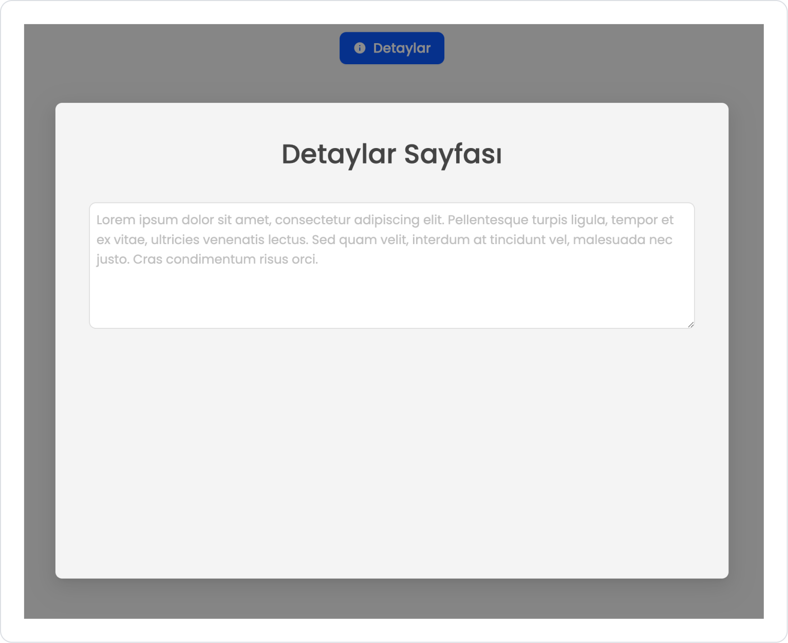 When the application is tested, click the Details button in the relevant content area. Clicking the button dims the current page, making it inactive, and opens the Details Page in the foreground. This structure allows the user to view detailed information without leaving the current page.