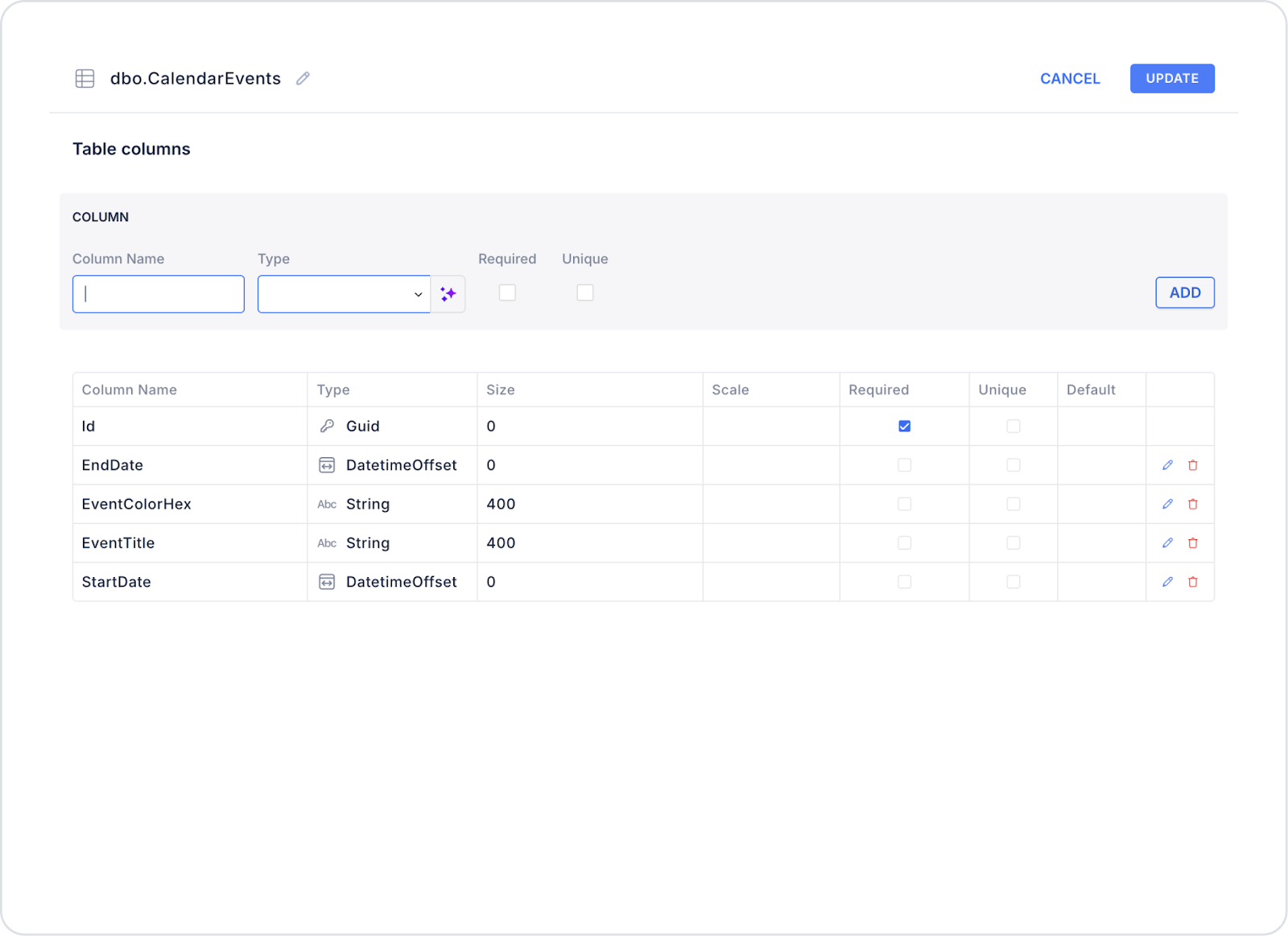 Click the + icon next to the Tables heading and name the table CalendarEvents.