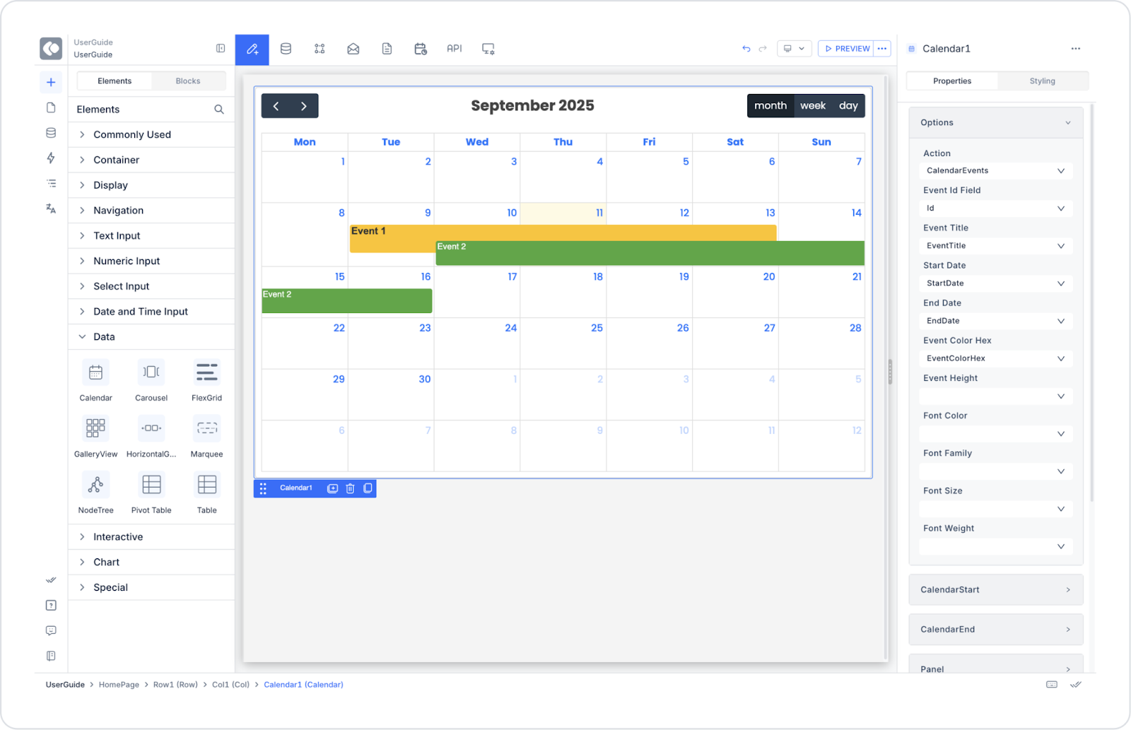 In a project management application, the Calendar element is used so that team members can track their meetings and tasks. Users can view relevant dates on the calendar and review the start and end dates of events. Events can be displayed in different colors (e.g., blue → meeting, green → task, orange → leave) for easier differentiation.