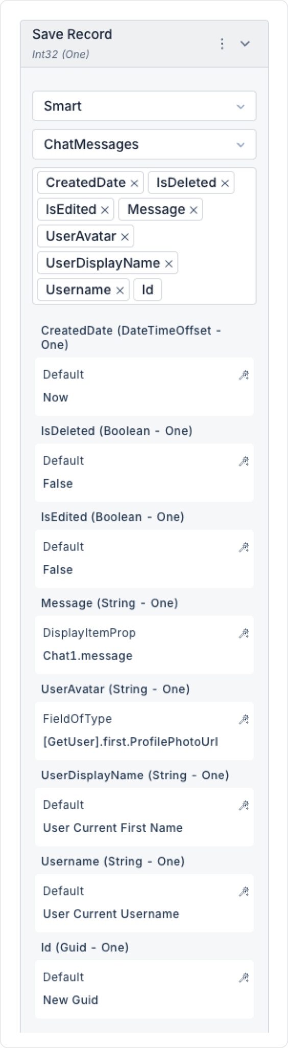 Within the Save Record action, select Select Table > ChatMessages and define the fields as follows.