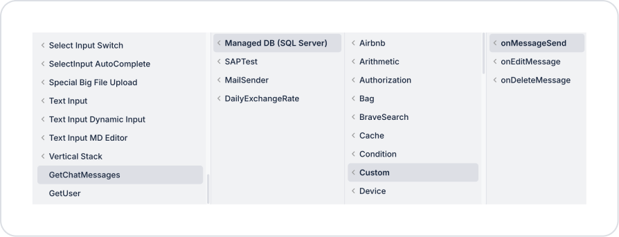 To allow users to send messages on the chat screen, an action must be created. This action is typically linked to the “Send” button and saves the user’s message to the data source (the chatHistory table).