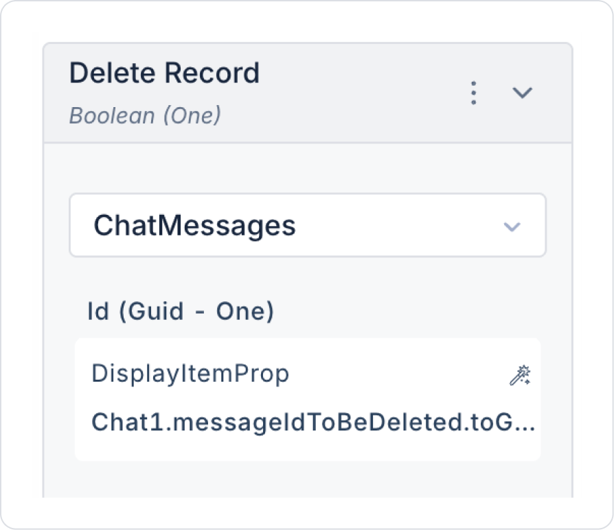 In Delete Record, define Select Table > ChatMessages and Id > Components > Chat > MessageToBeDeleted > To Guid.