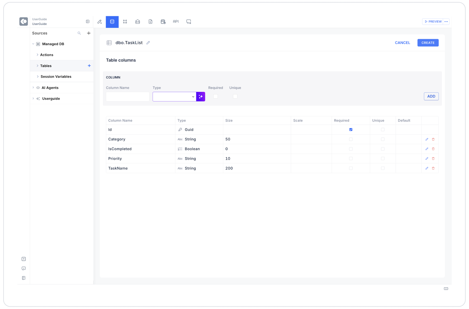 Then, create a new SQL Action from the Actions section and name it TaskListData: