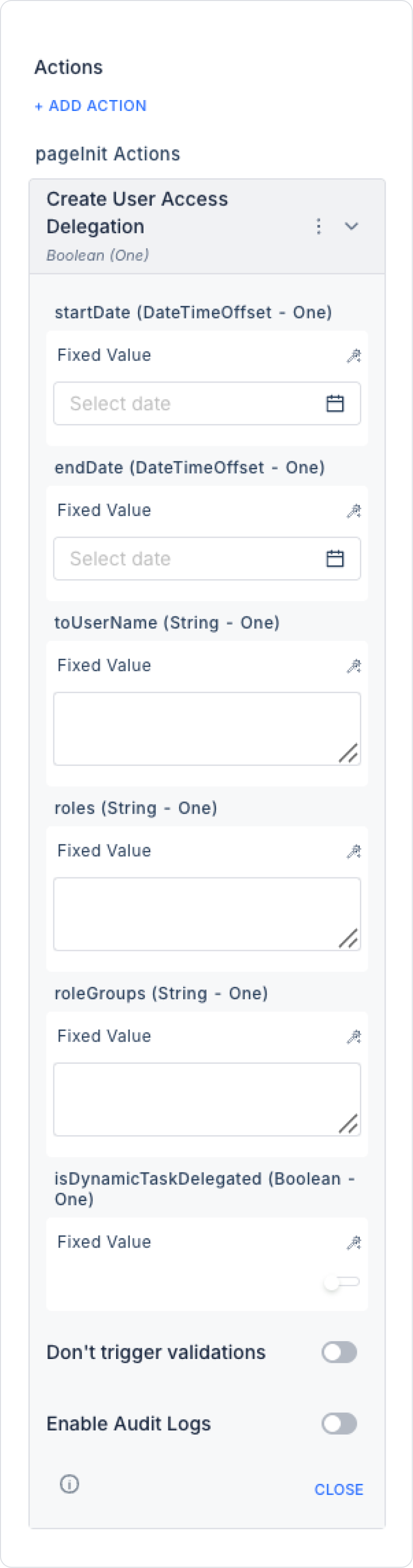 When the user clicks the button, the Create User Access Delegation action runs and the system automatically defines the permissions for the specified roles between the specified dates.