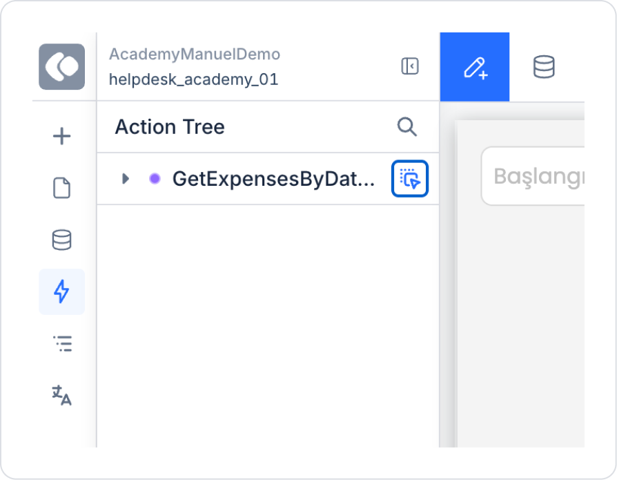 To use the action directly as a ready-made table, navigate to the ActionTree area in the left side panel and drag the nearby blue icon of the GetExpensesByDateRange action onto the page.
