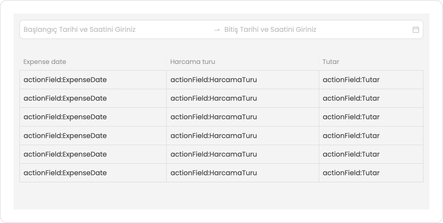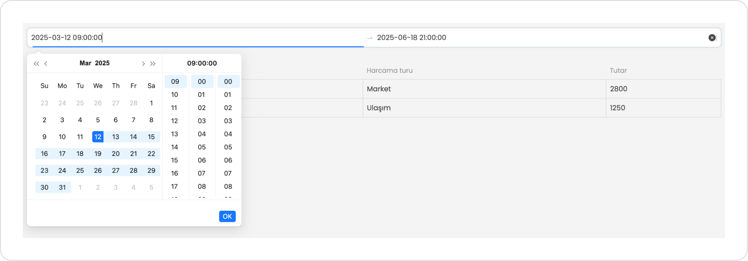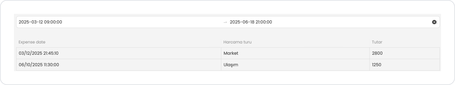 When the user specifies a date range, the expense type, amount, and expense date information for the selected start and end dates and times are automatically listed in the table. This allows the user to review all expenses for a specific period in a single screen in an organized and understandable manner.