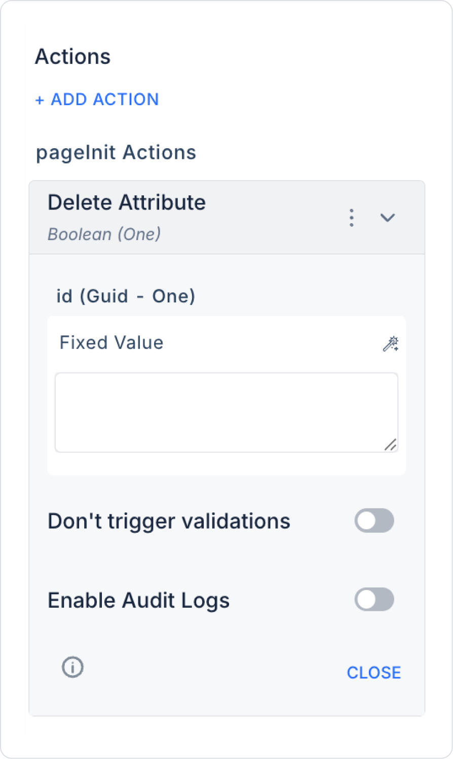 Kuika's Delete Attribute action is used to delete a previously defined attribute from the system within the EAV (Entity-Attribute-Value) data model. This action facilitates the management of dynamically created fields and allows attributes that are no longer used or incorrectly defined to be safely removed from the system.