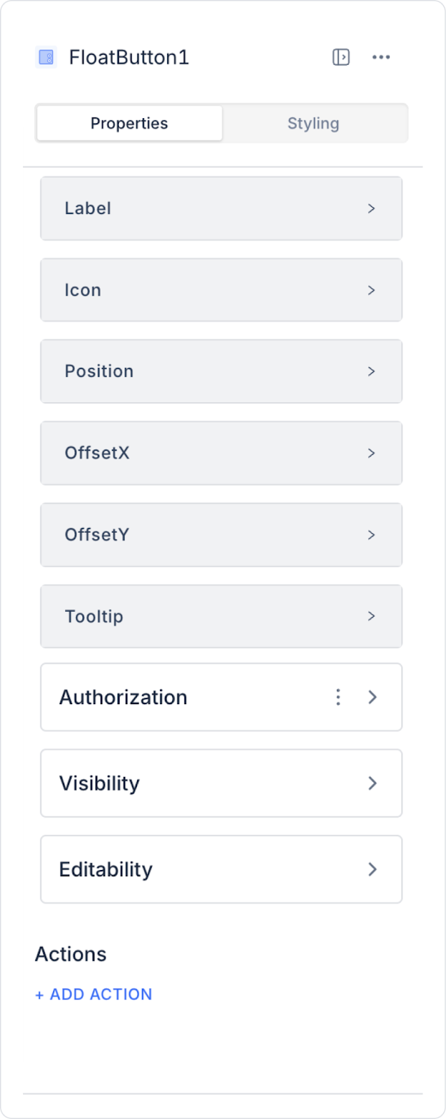 The FloatButton element is a UI element that directly manages user interaction through actions. When the element is selected, the +ADD ACTION field in the Properties panel becomes active and the following trigger can be used: