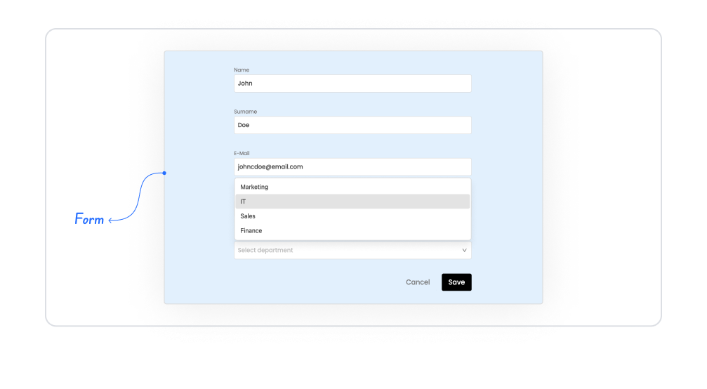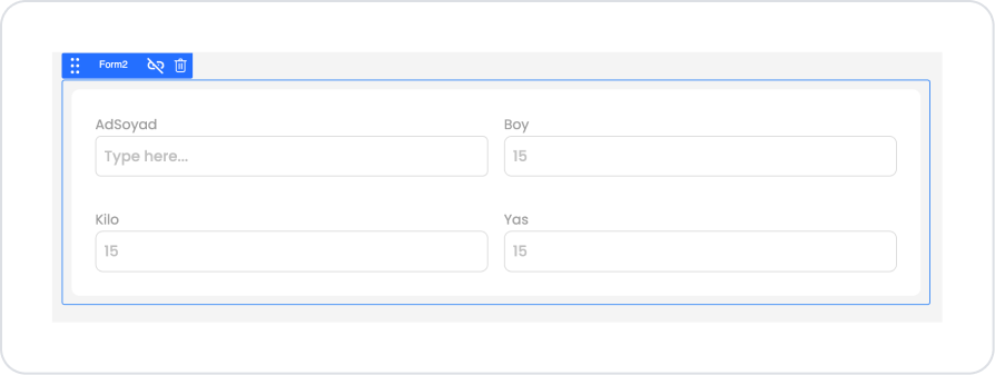 The form element is one of the basic UI elements that allows you to quickly and flexibly perform data collection, editing, and display operations in your applications. With its open structure for user interaction, it combines text inputs, selection fields, date fields, counters, switches, and many other form elements under a single structure. With the form element, you can: