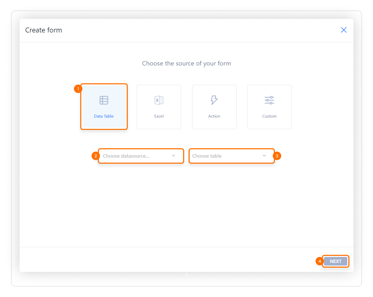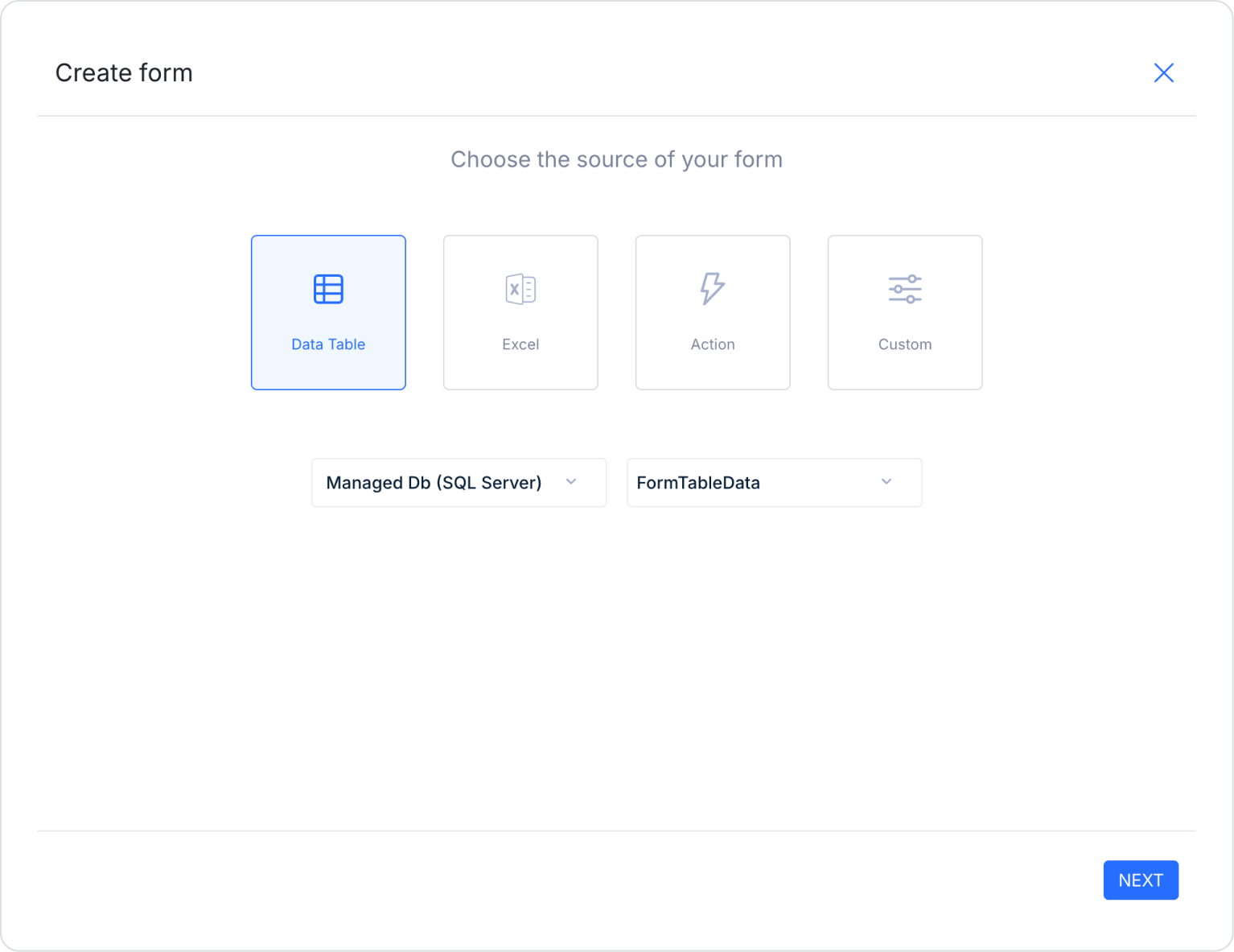 After selecting the data source, click NEXT to proceed to the form details screen.