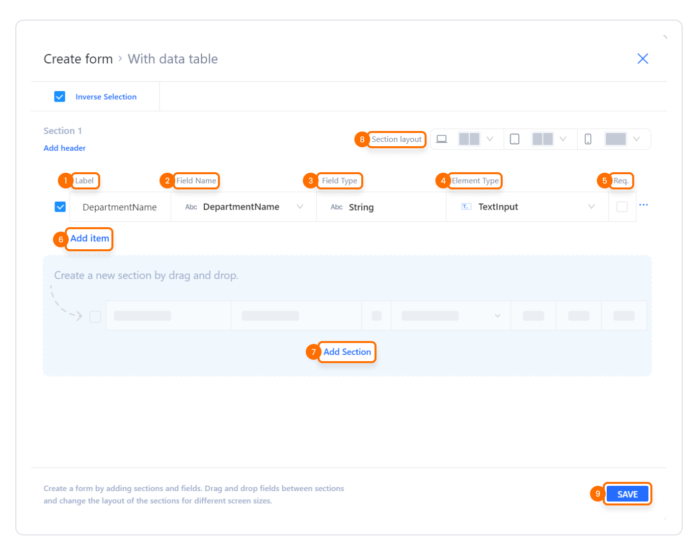 In the table generated based on the Excel columns, edit the Label, Field Type, Element Type, Required fields.