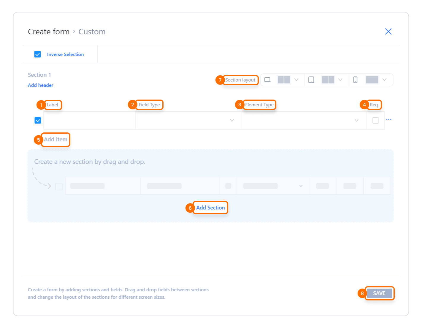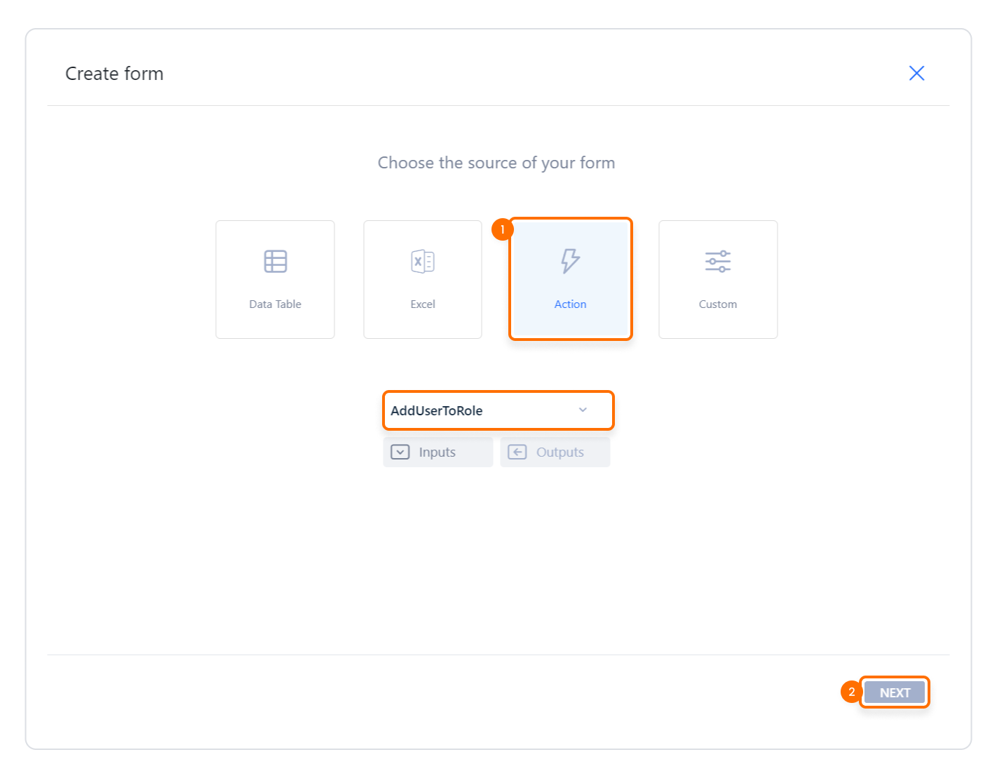 Drag the form element onto the screen, select Custom (1) → NEXT (2).