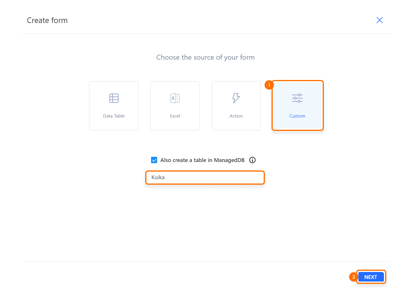 Optionally, you can also create a table linked to the form structure with the “Also create a table in ManagedDB” option.