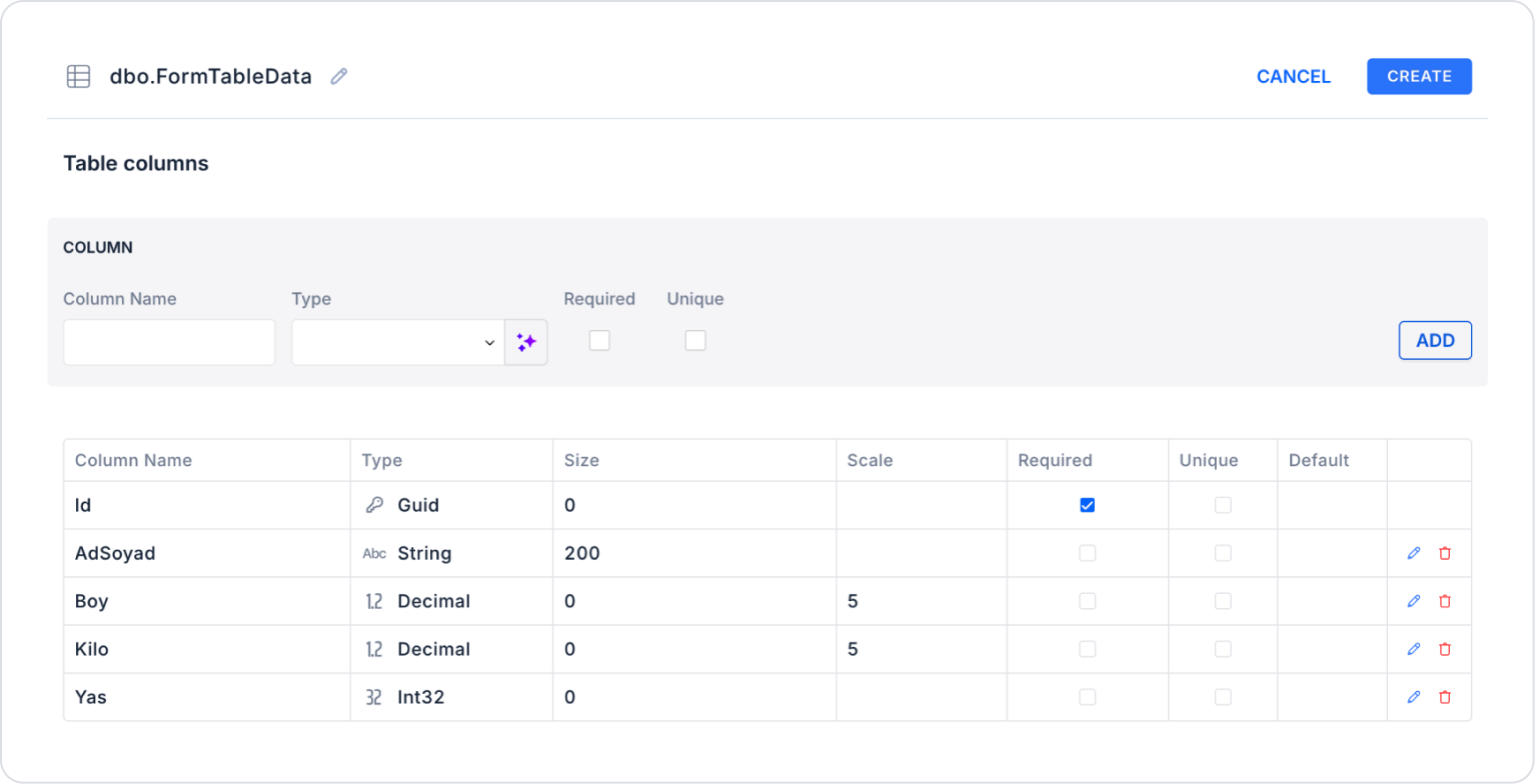 The Create Form modal provides a detailed structure where you can manage the column/field structure of the form.