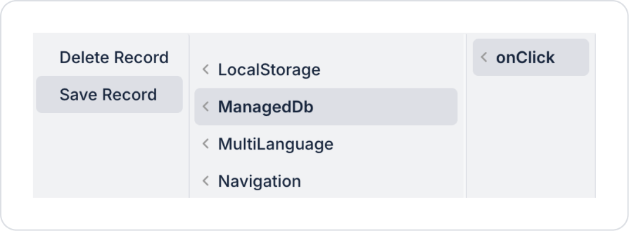 Add the ready-made action Button > Properties > Add Action > onClick > ManagedDb > Save Record to the Button element.