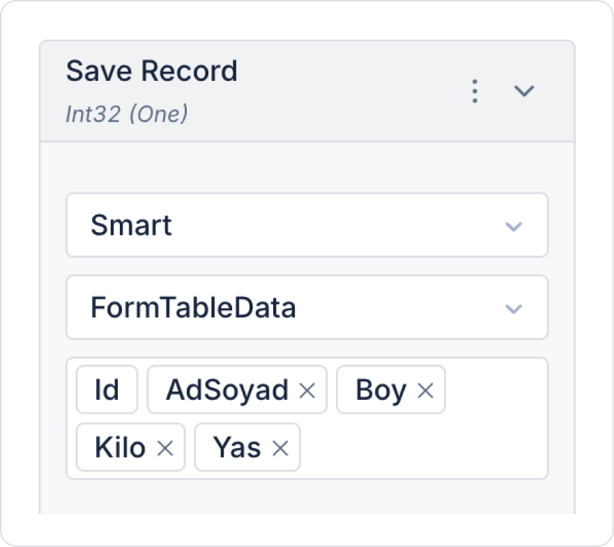 In the Save Record action, select the FormTableData table. Select all fields in the Select Columns field that opens and make the following definition.