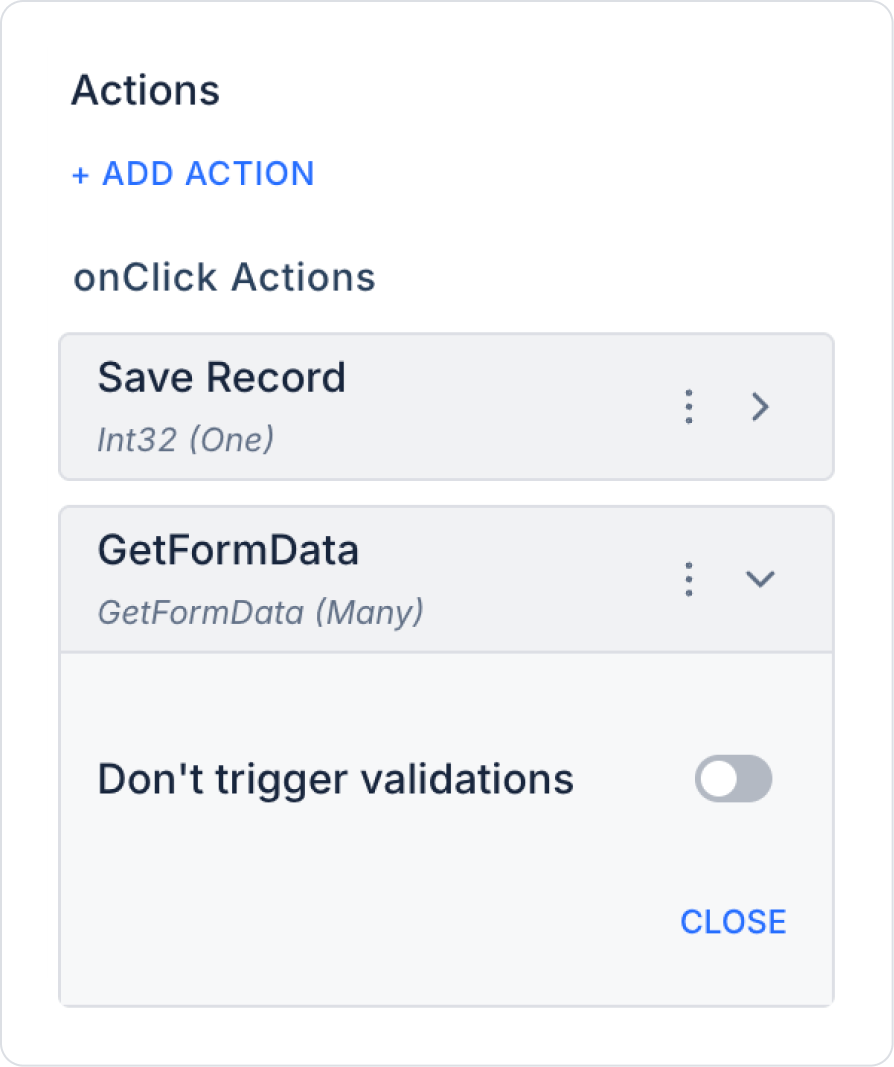 Data submission, validation, or registration processes are managed by actions added to the buttons within the Form. For example: