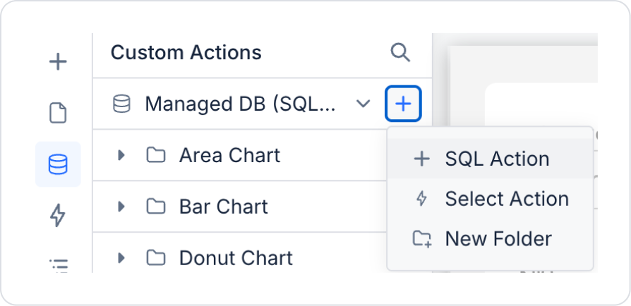 In the UI Design screen, go to the Custom Actions area from the side panel and click on Sql Action to create a new action.