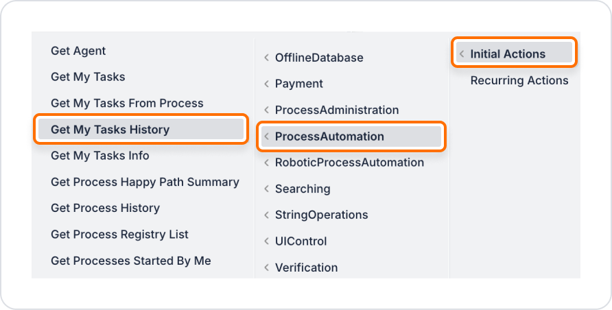 From the + ADD ACTION menu, add the Process Automation > Get My Tasks History action according to the trigger event you want (Initial Actions, OnClick, OnBlur, etc.).