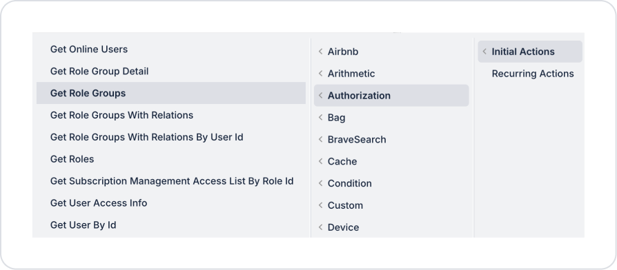 The Get Role Groups action is particularly preferred in role group listing screens, role group selection fields (dropdown, table, list, etc.), and role-role group association processes. The action contributes to the centralized management of role groups as part of the authorization system.
