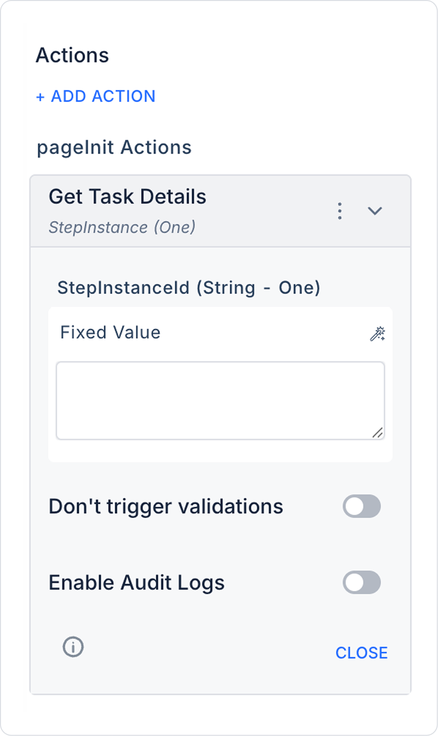 From the + ADD ACTION menu, add the Process Automation > Get Task Details action according to the trigger event you want (Initial Actions, OnClick, OnBlur, etc.).