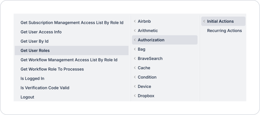 Select the relevant element and add the Authorization → Get User Roles action from the + ADD ACTION menu, depending on the trigger event to be used.