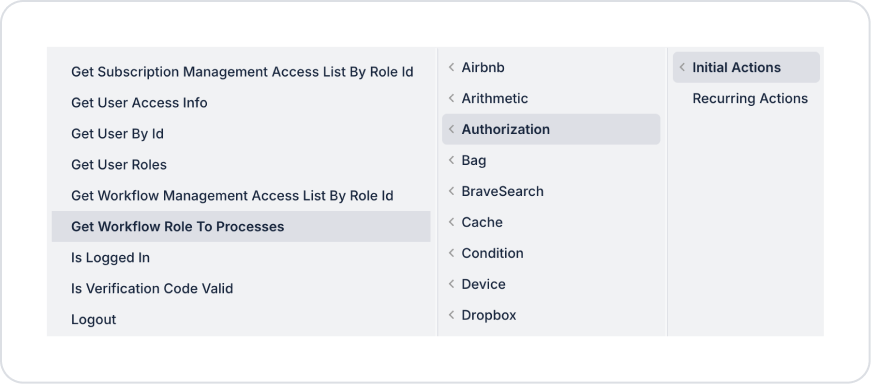 Kuika's Get Workflow Role To Processes action is used to list which roles are associated with which processes defined on the workflow (Process Automation) side. This allows role-based process accesses to be viewed, reported on management screens, and used as a data source for authorization checks.
