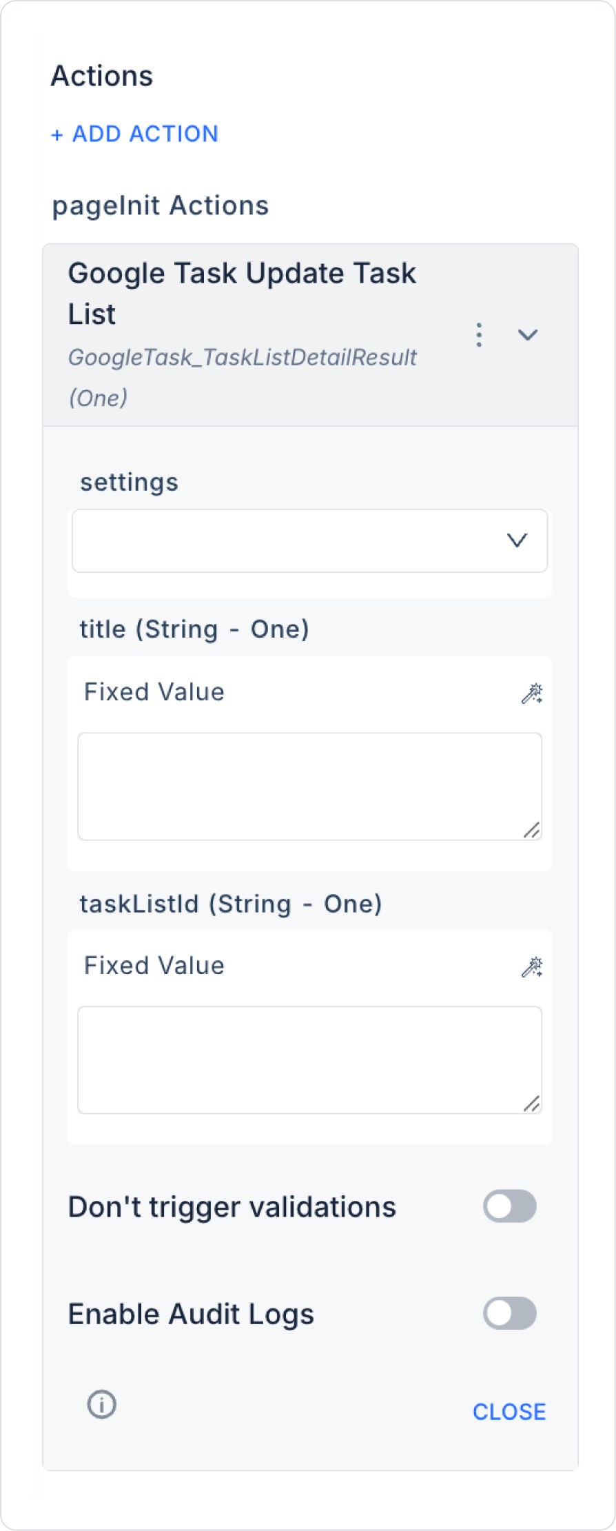 Select UI Design → + ADD ACTION → Google → Google Task Update Task List.
