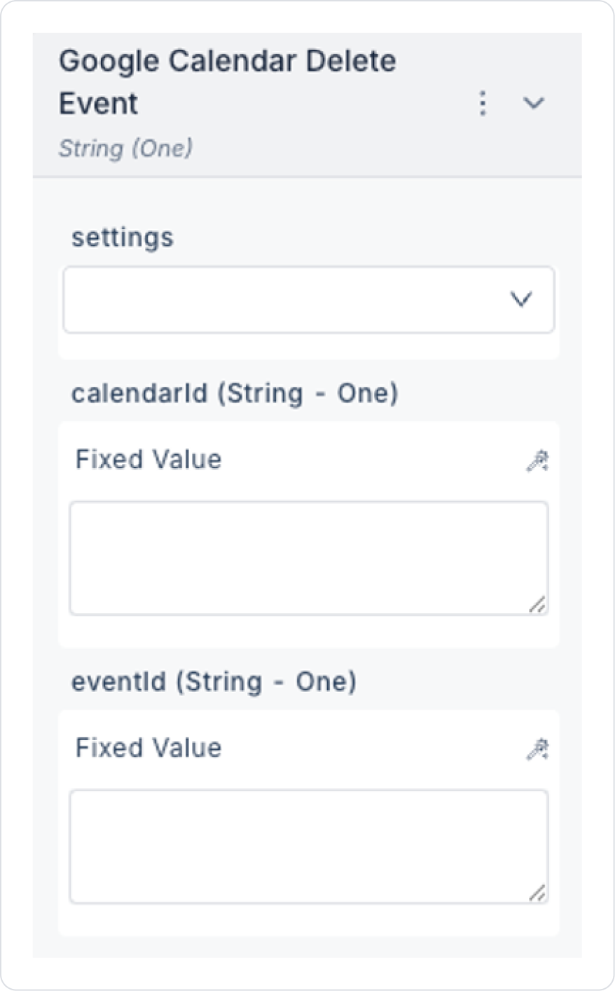 eventId (String – required): Unique ID of the event to be deleted. eventId can be obtained with the Google Calendar List Events action.