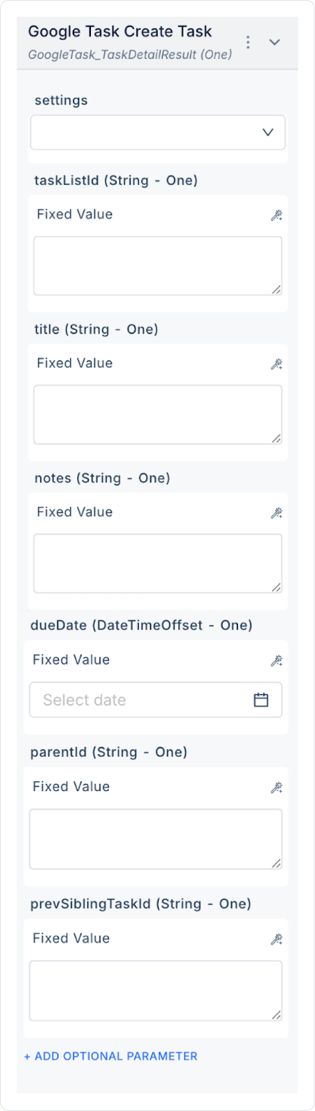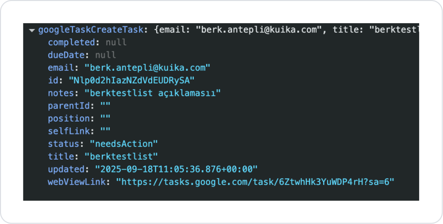 taskListId (String – required): ID of the list to which the task will be added.
