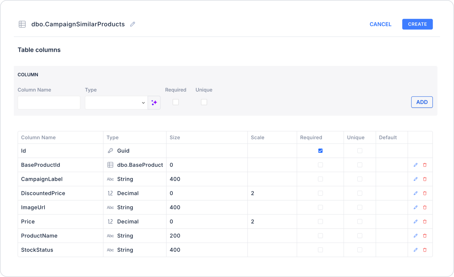 When adding the Price and DiscountedPrice columns, set them to Decimal data type with Decimal Scale > 2. Enter the BaseProduct table name in the BaseProductId type field.