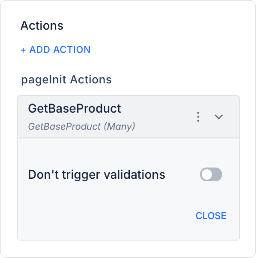 On the page, add the Add Action > Initial Action > Custom > Managed Db > GetBaseProduct action.