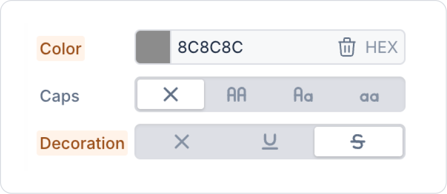Click on the first Label Element in the lower section. In the Label > Styling > Text area, set the Color and Decoration fields as shown below.