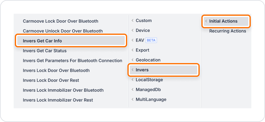 A fleet management company wants to continuously monitor the mileage, fuel, and battery status of its vehicles. With the Invers Get Car Info action, the status of each vehicle can be monitored in real time through the application, enabling quick intervention when necessary.