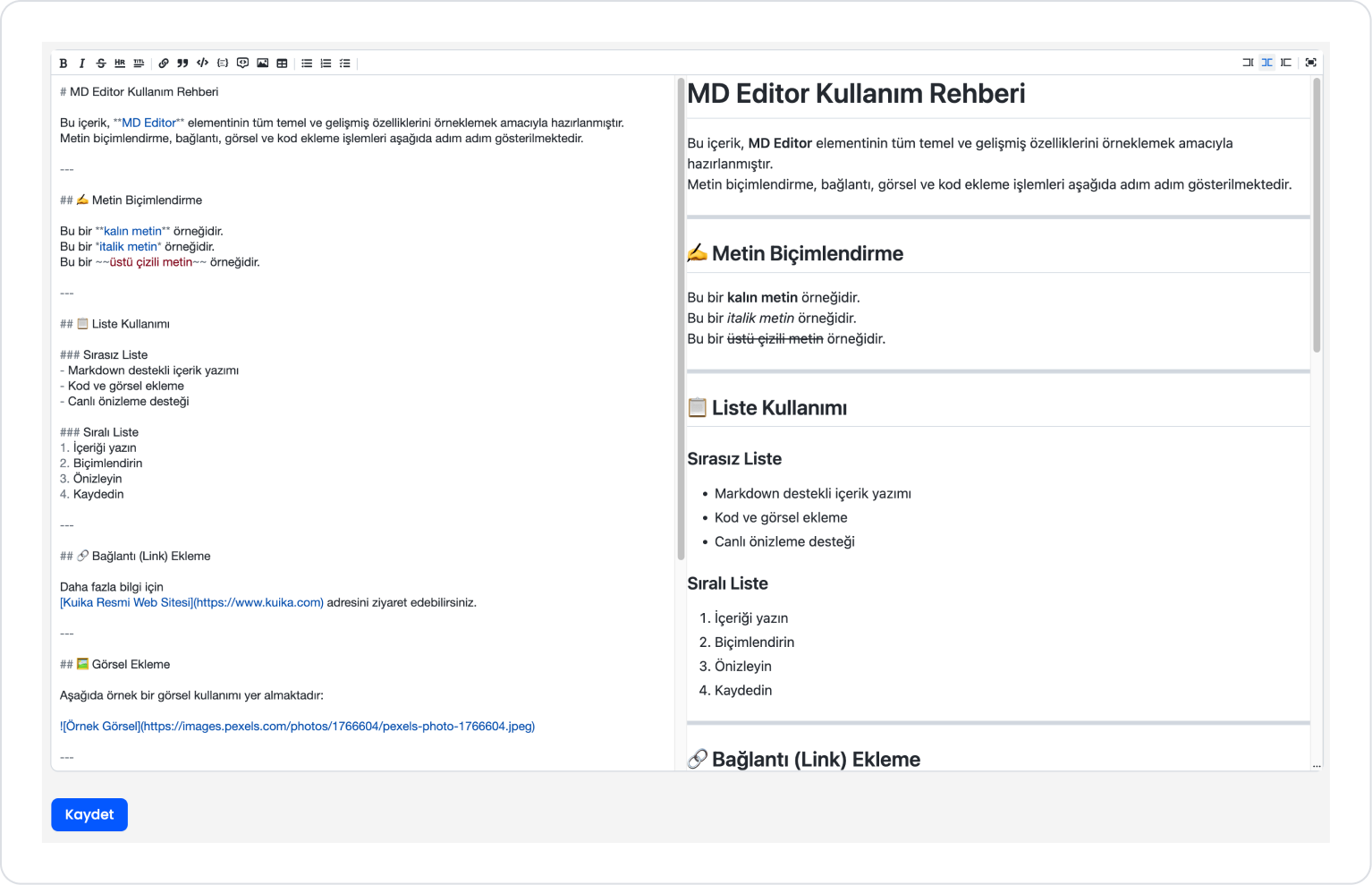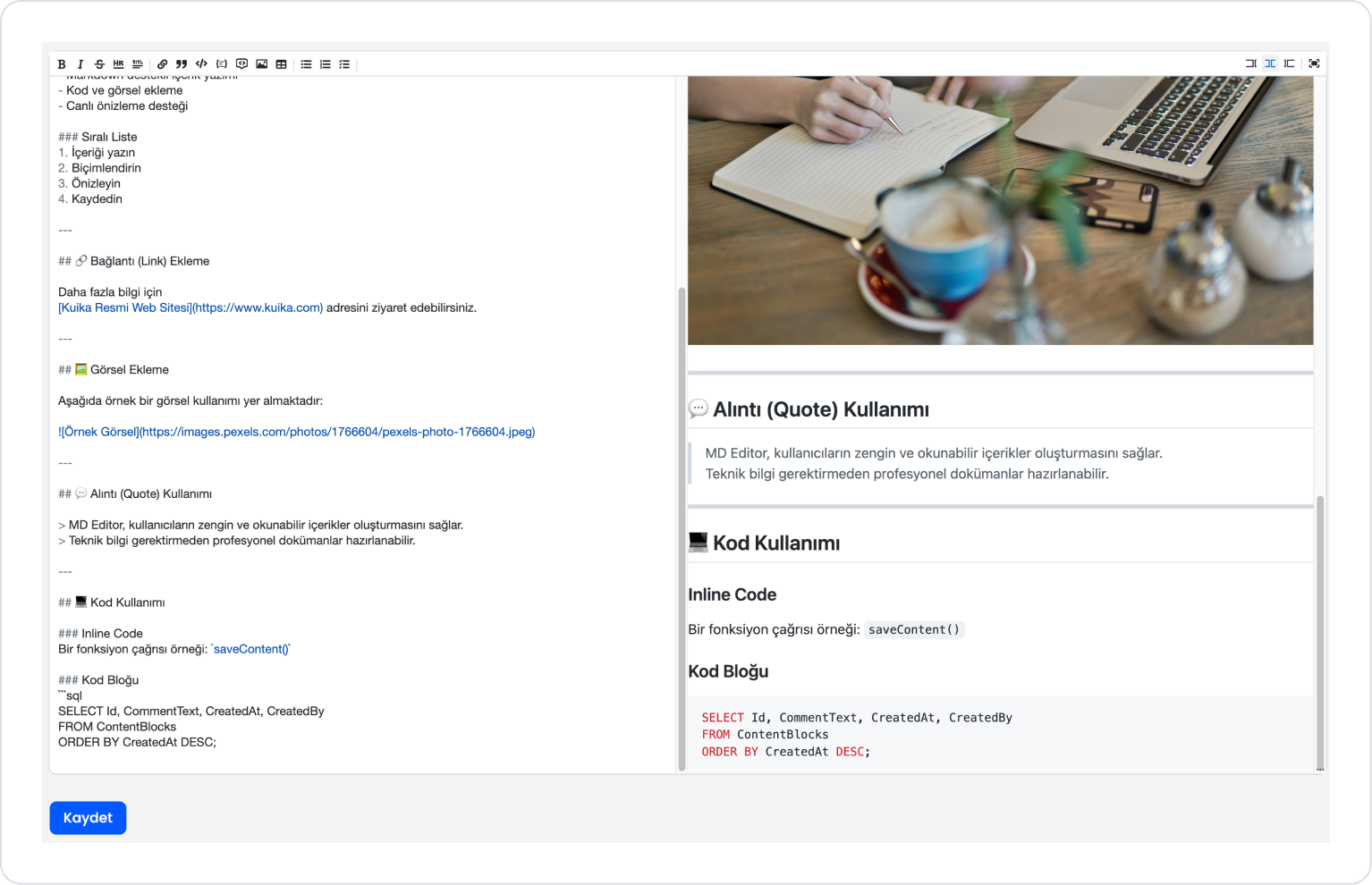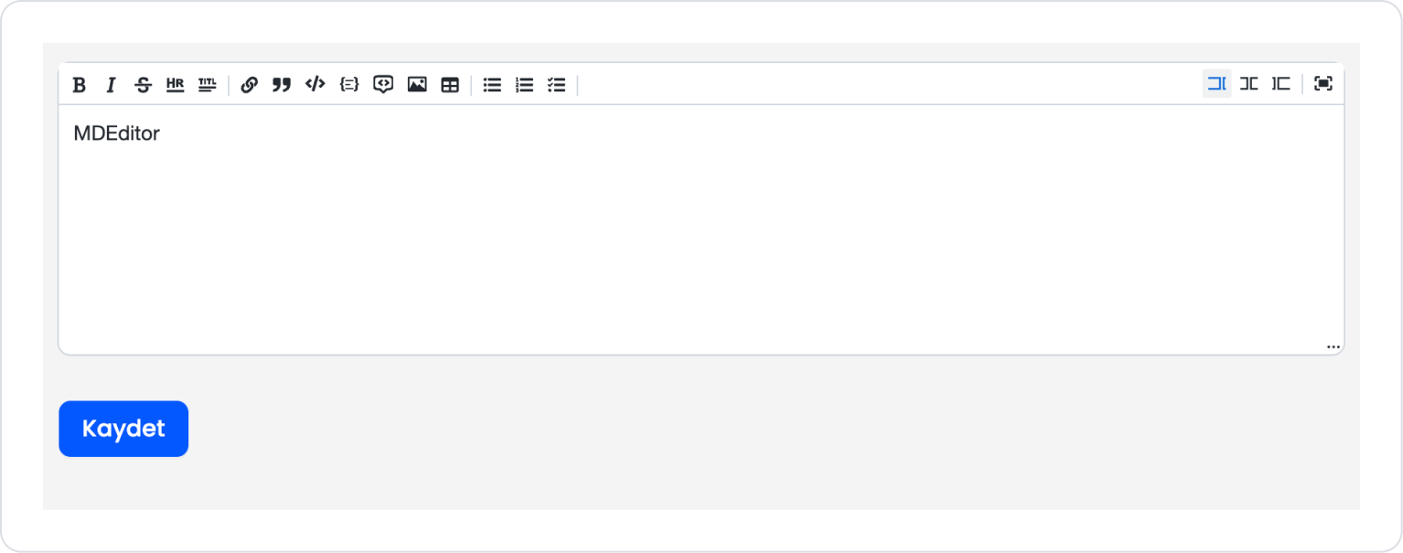 In an application, users want to create explanatory, documentation, or informative content not only as text, but also in an organized manner with code blocks, images, and links. In this scenario, MD Editor enables the preparation of rich and readable content thanks to its Markdown-supported tools.
