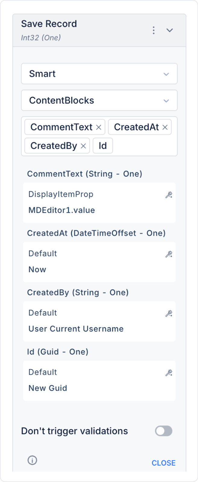As a result of these definitions, all fields of the Save Record action should be as follows.