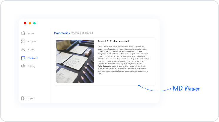 In this scenario, project evaluation content is stored in Markdown format and displayed on screen using the MD Viewer element.