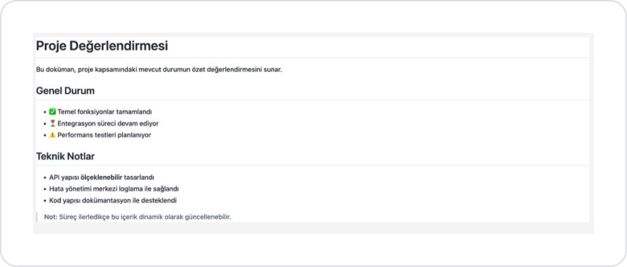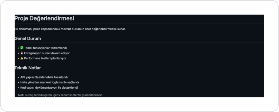 When the application is tested, the project evaluation content is displayed in a neat and readable manner on the MD Viewer element with a dark theme. Headings, subheadings, bullet points, and highlights are automatically rendered while preserving the Markdown format. When the user enters the screen, the project status, technical notes, and warning information are presented in a single documentation flow and are instantly reflected on the screen when the content is updated.