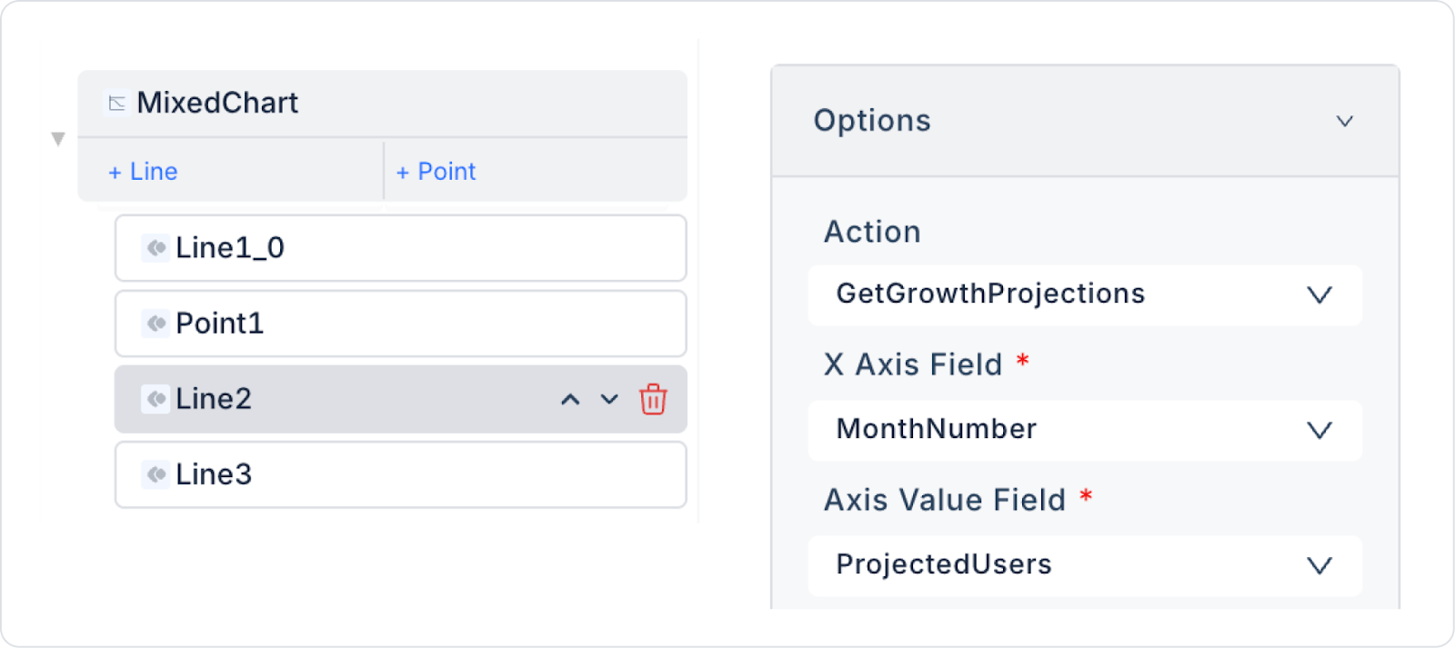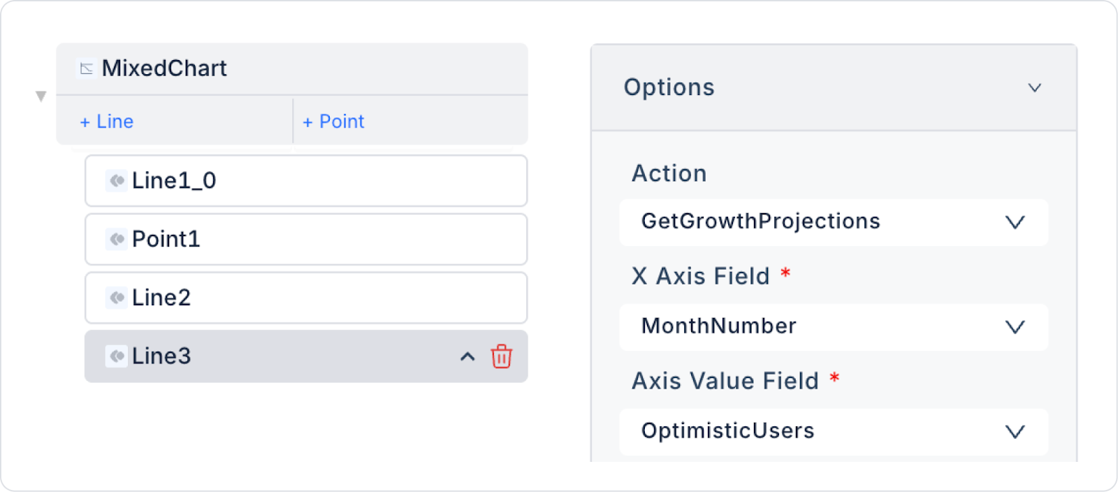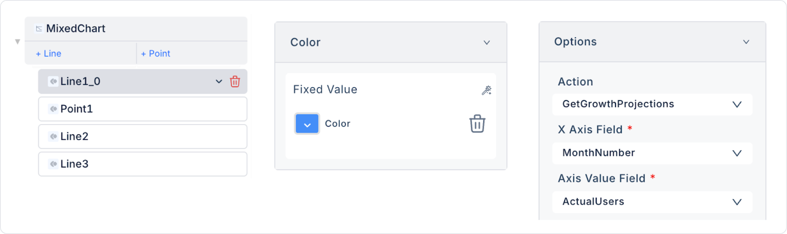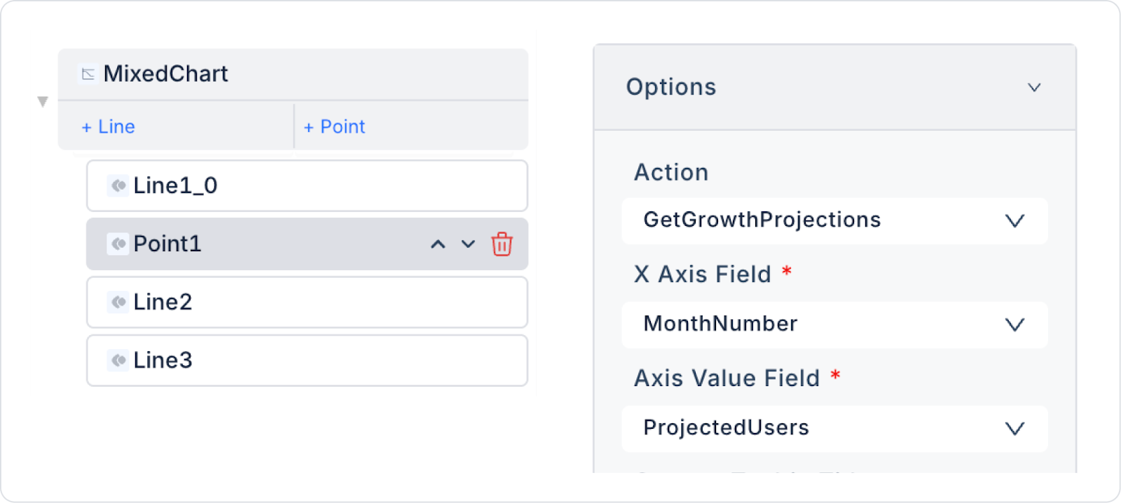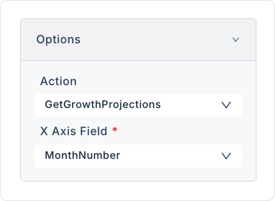 Add the MixedChart > Properties > Options >Action > GetGrowthProjections action to the Mixed Chart to provide the data. Make the following definitions: