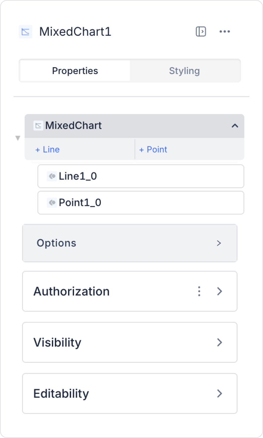 The Mixed Chart element allows you to visualize different data types simultaneously by combining multiple chart types within a single structure. It enables the use of chart types such as bar, line, and area together on the same chart. This feature is highly effective for comparing both categorical and time series data, presenting trends and distributions simultaneously. It makes complex data sets more readable and helps users analyze relationships between data points through a single chart.