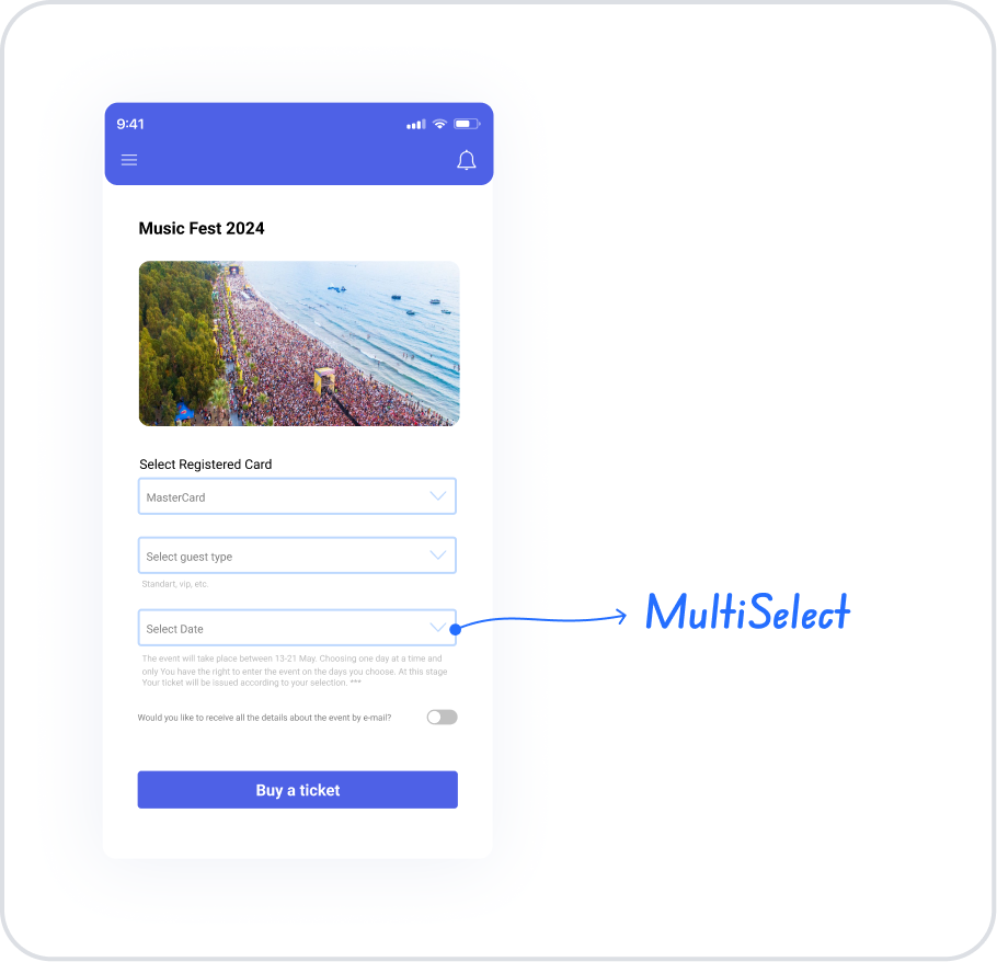 Use it in scenarios requiring multiple selections. If the user needs to select multiple options, the Multi Select should be preferred; the Radio Button is recommended for single selections.