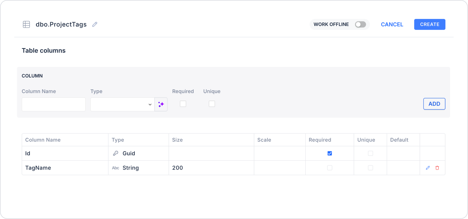 Action to Add Sample Data (InsertProjectTags): To test the application with sample data, add the following SQL action and click the TEST button.