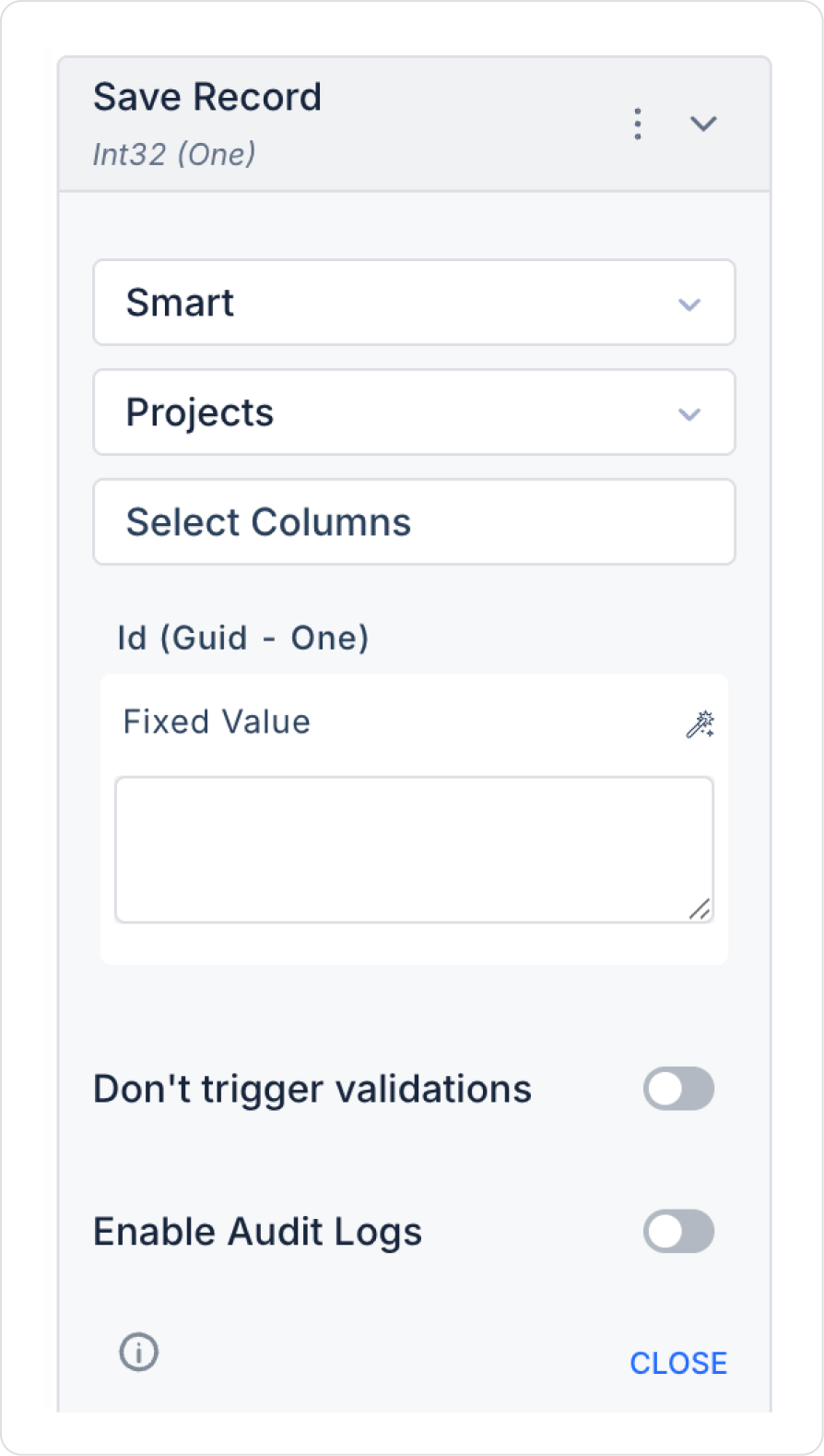 For the save operation, add the Button > Properties > Add Action > onClick > ManagedDB > Save Record action.