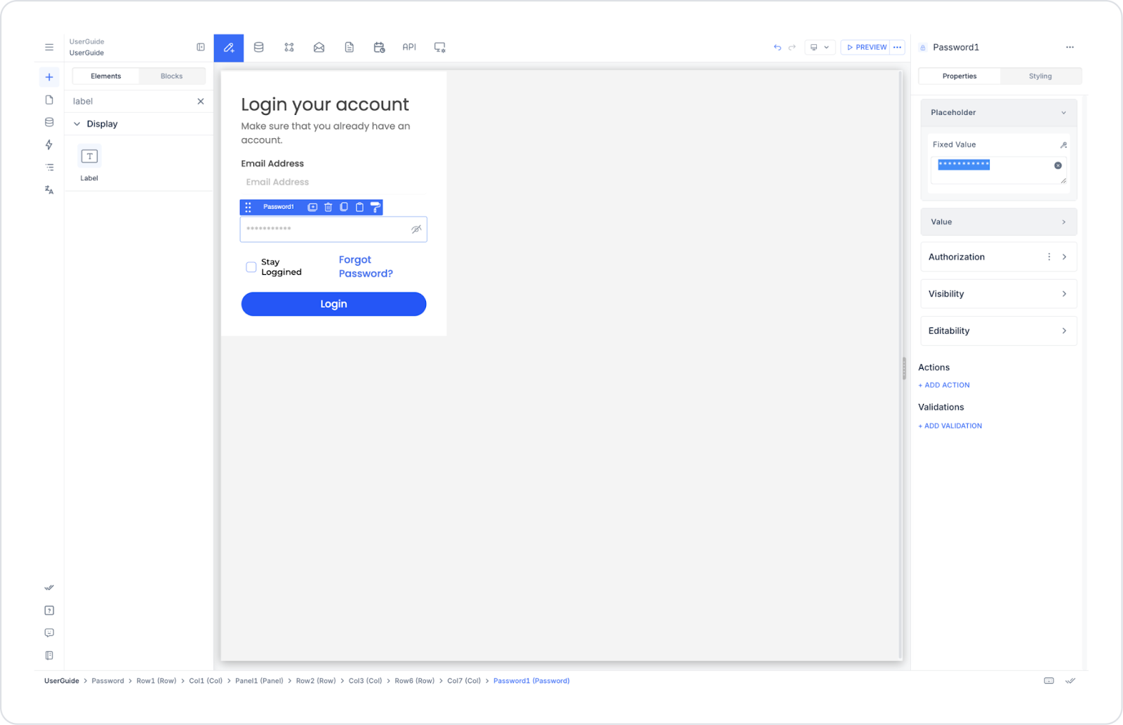 Kuika's Password element allows users to securely enter passwords in applications. Characters entered are hidden for security purposes using asterisk (*) or dot (•) symbols. Users can make the password visible by clicking the “Show” (eye) icon. The Password element also integrates with Configuration Manager → Password Policy settings to support strong password creation rules.