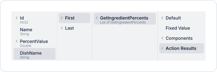 Set the text to Label > Properties > Value > Action Results > GetIngredientPercents > First > DishName.