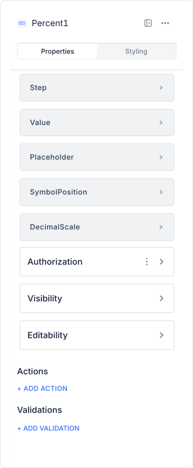 Since the Percent element is an input element that aims to receive values from the user in percentage format, it works with event-based action triggering logic. Actions are not linked to the element itself, but to the event triggered as a result of user interaction.